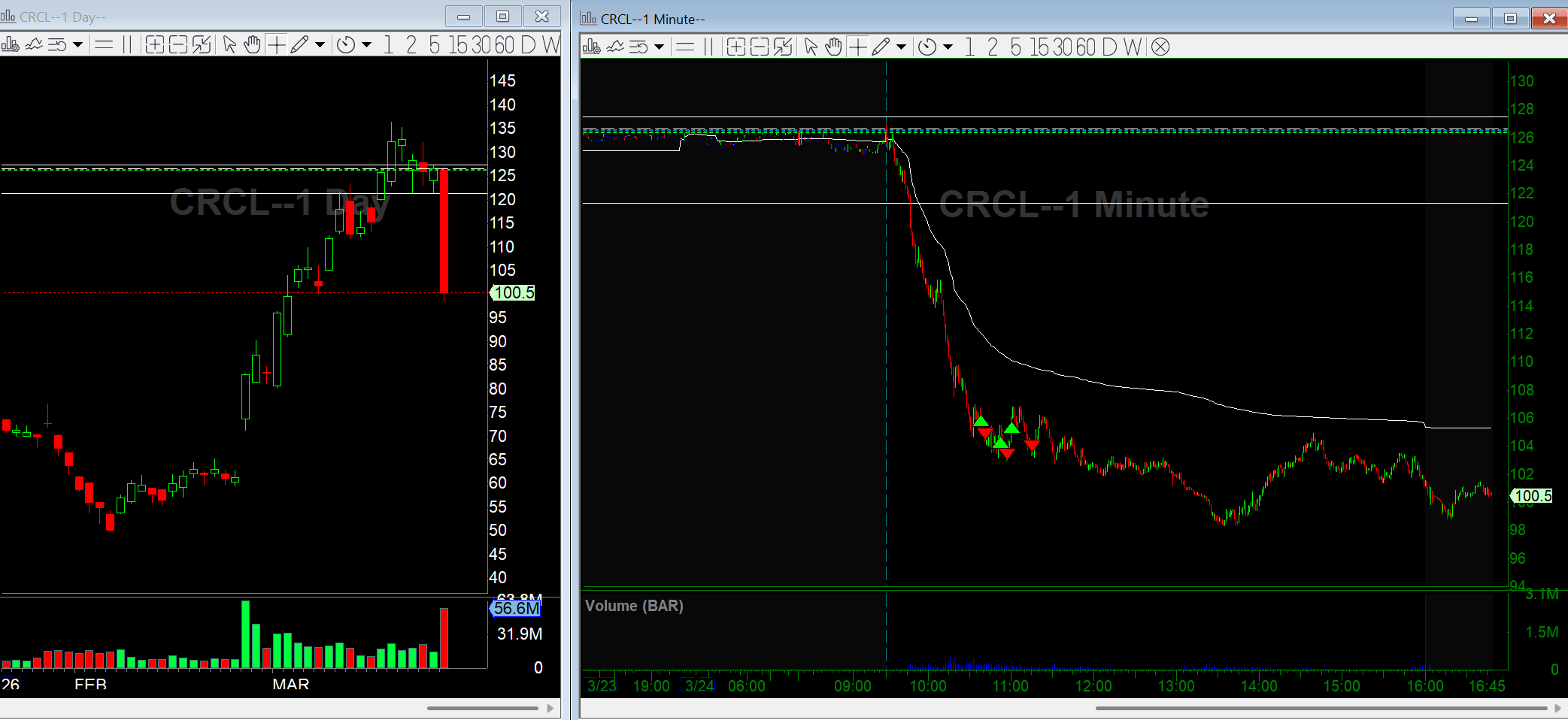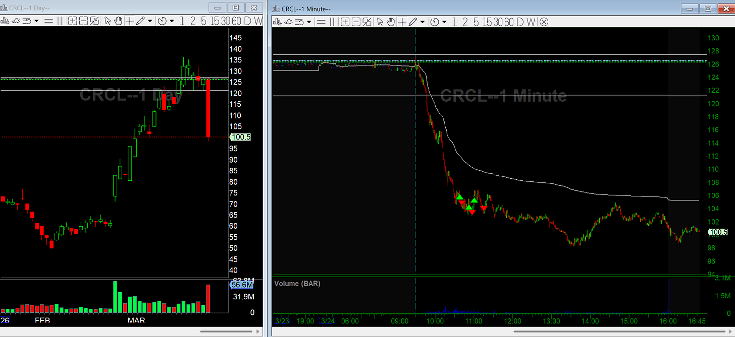 Attempted mean reversion longs on CRCL near 100, didn’t work, moved on.
