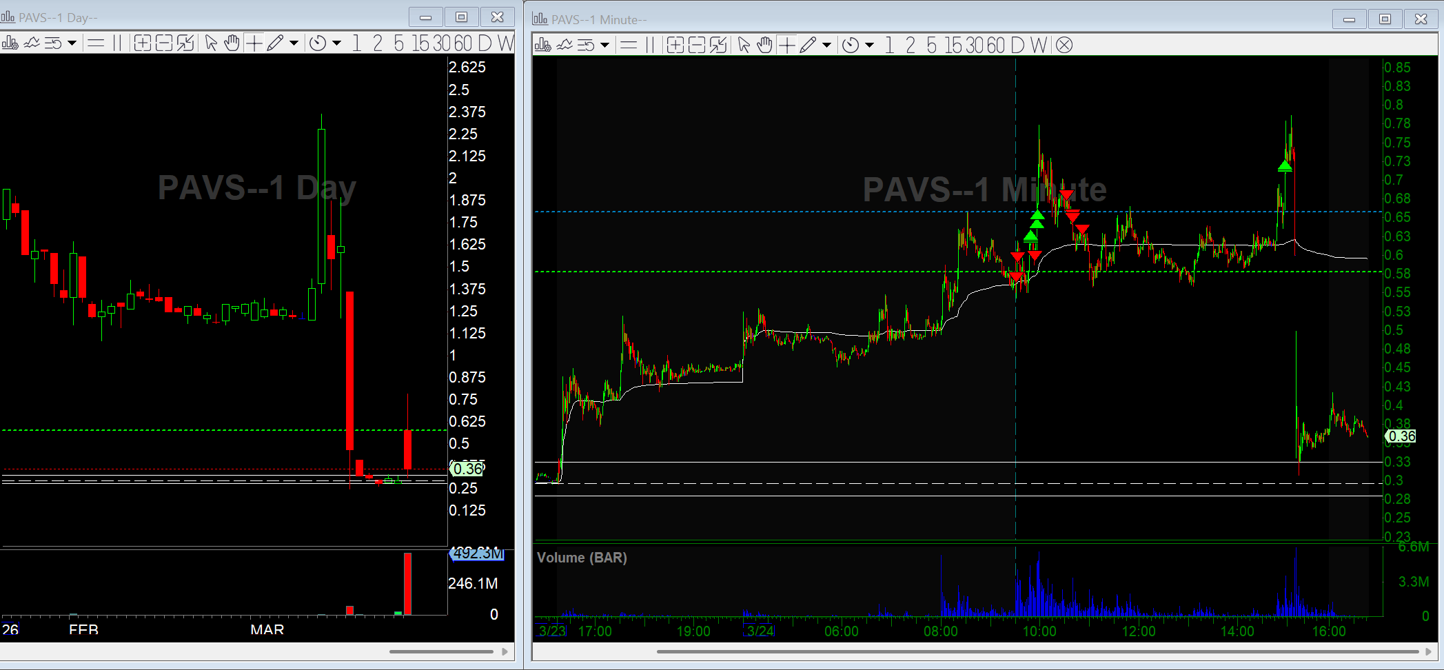 PAVS was the top gapper this morning after news yesterday that they’d terminated their $100 million ATM, though they still had dilution available through a $200 million shelf. It’s a historical fader, so I liked the short thesis, but there were some red flags.