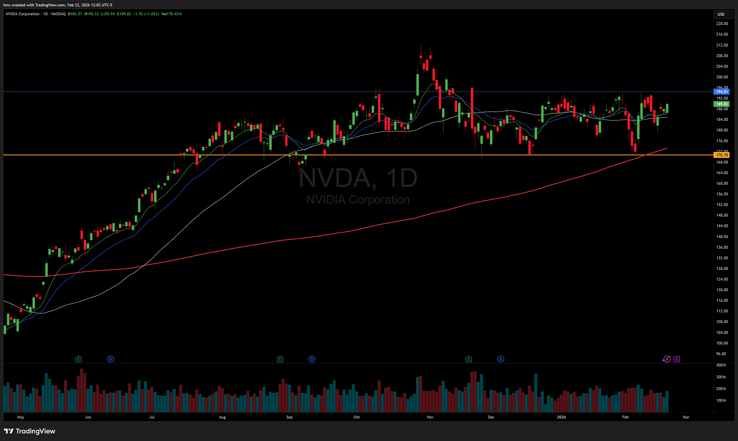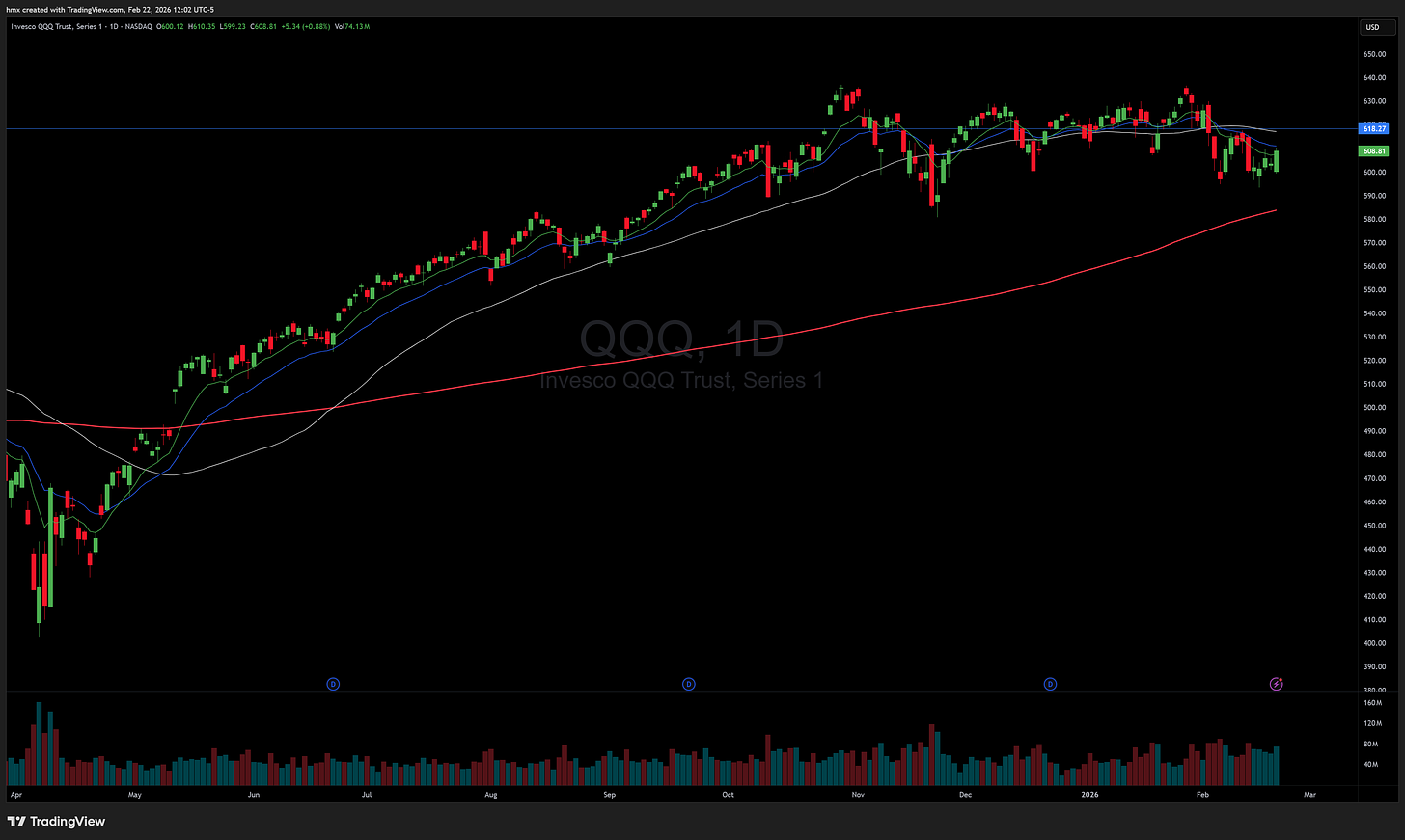 Stocks finally put together a constructive week. The S&P 500 SPY 0.00%↑ closed up about 1.1%, the Nasdaq QQQ 0.00%↑ gained 1.5% and snapped its five-week losing streak, while the Russell 2000 IWM 0.00%↑ lagged again with little meaningful participation. Friday’s push came after the Supreme Court struck down Trump’s tariffs, triggering a broad rally into the close. At the same time, Q4 GDP came in at 1.4% and PCE inflation ran hotter than expected, keeping the stagflation narrative in play. Oil USO 0.00%↑ jumped roughly 6% on the week to a six-month high as tensions near Iran added a risk premium.