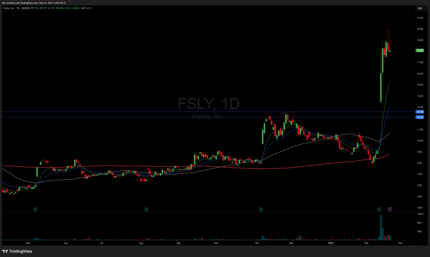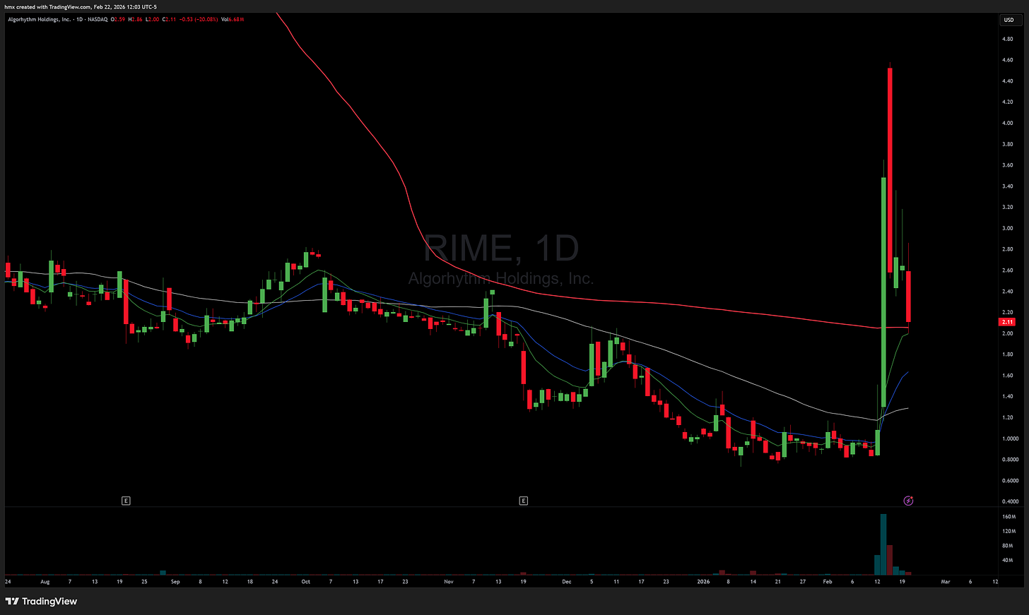 Low float action stayed selective this week, with RIME 0.00%↑ stealing the show on Tuesday after its AI-driven multi-day surge of roughly 300%+ off early February levels and a big 70%+ post-market spike into the prior week. Once the momentum finally cracked, it delivered a clean backside mean-reversion fade. RXT 0.00%↑ was the other liquid name worth real attention, ripping more than 200% off recent lows as it pushed toward its 200-day and printed over 500 million shares on the week ahead of its February 26 earnings date, which made it the better structured long-side trade while shorts had to respect a strong trend and crowded tape.