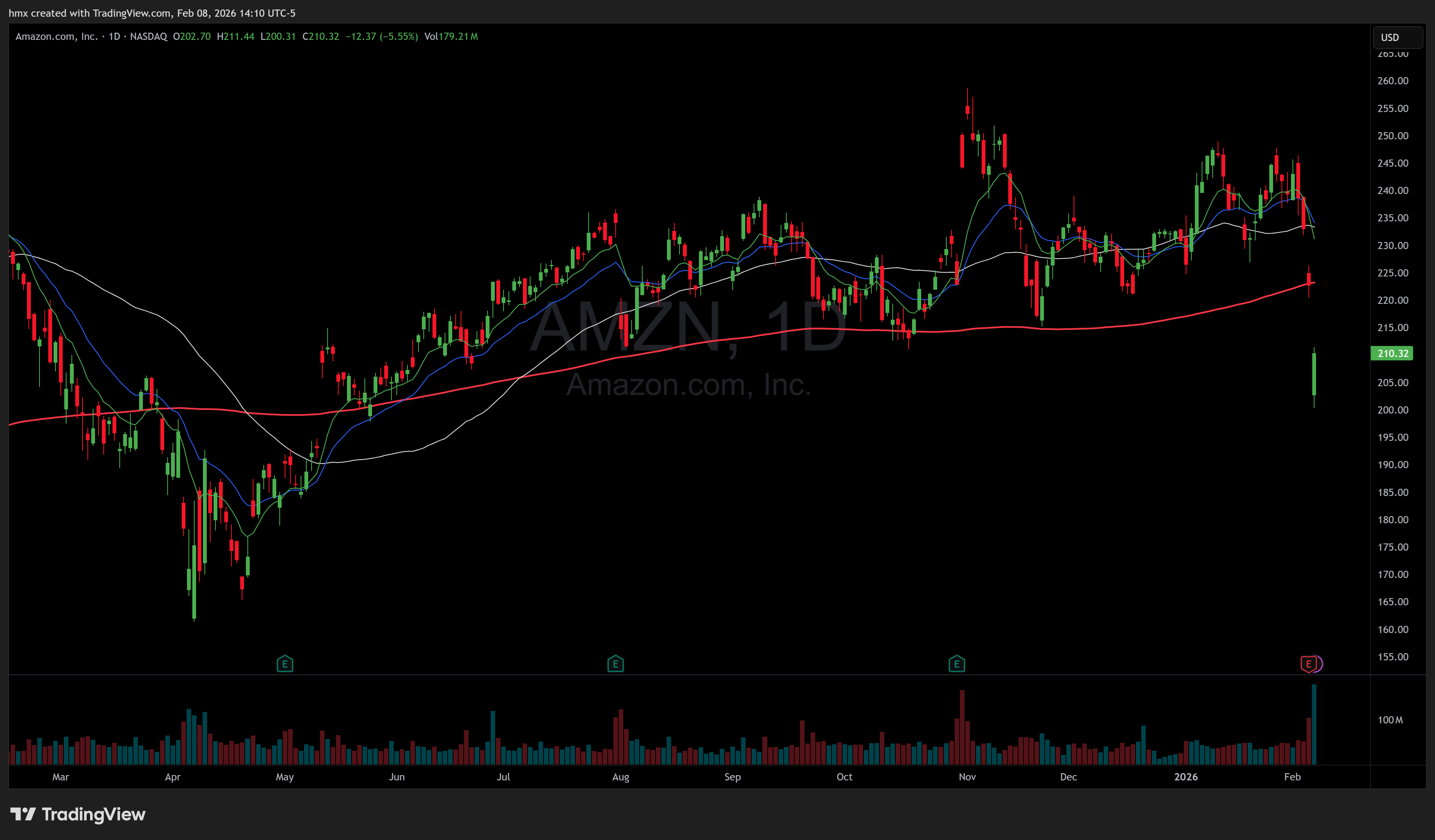 AMZN 0.00%β delivered Q4 results that beat on revenue and showed solid AWS growth, but shares sold off after management outlined a $200B 2026 cap-ex plan tied to AI and infrastructure spending. The size of that investment overshadowed the quarter itself and weighed on large-cap tech sentiment for much of the week.