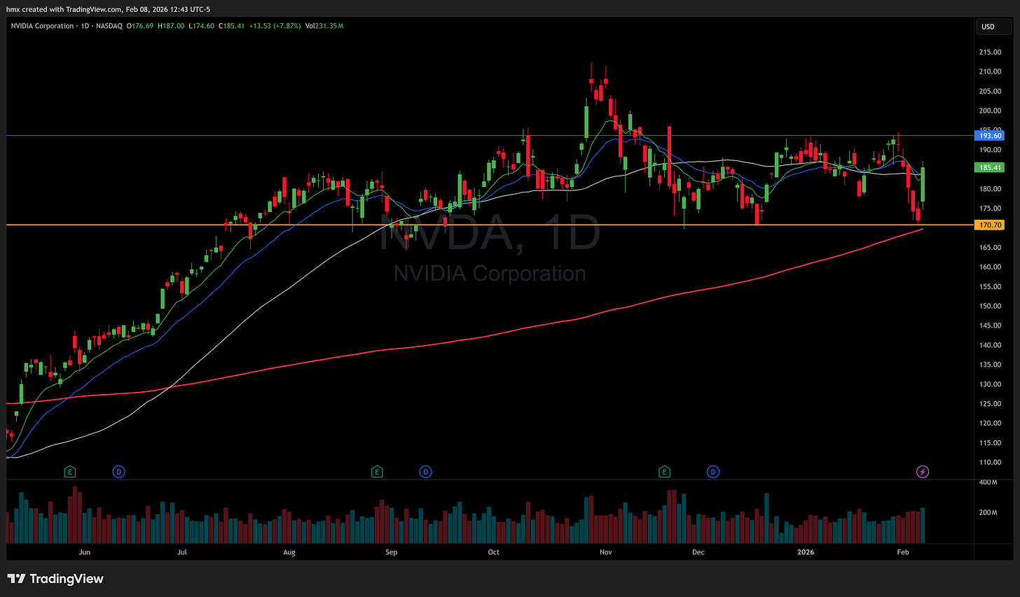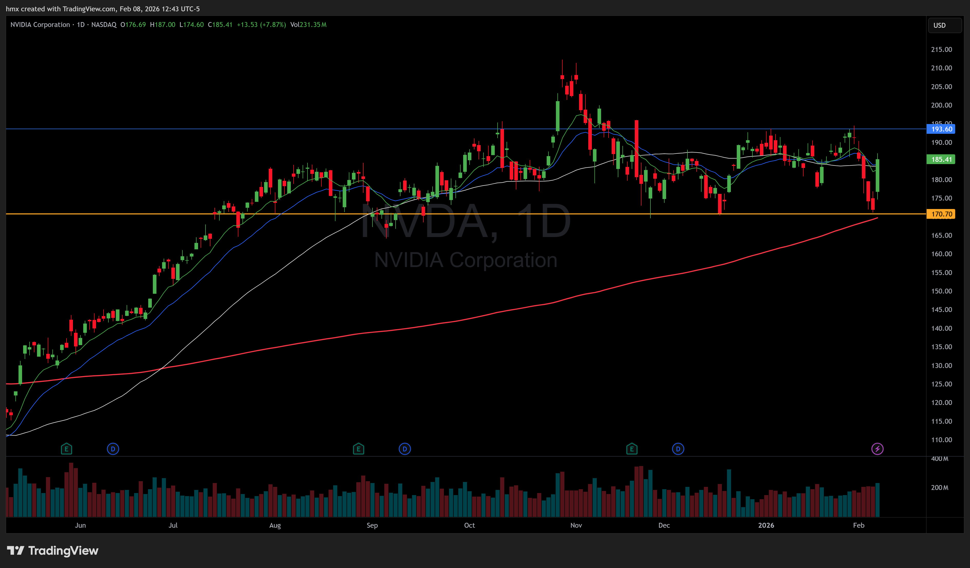 Rotation showed up clearly at the sector level. Industrials and economically sensitive names led, with stocks like CAT 0.00%β and DE 0.00%β holding firm and pushing higher even as tech slipped. Semiconductors were volatile midweek but caught a strong bid into Friday, with NVDA 0.00%β and AMD 0.00%β helping stabilize the Nasdaq late.