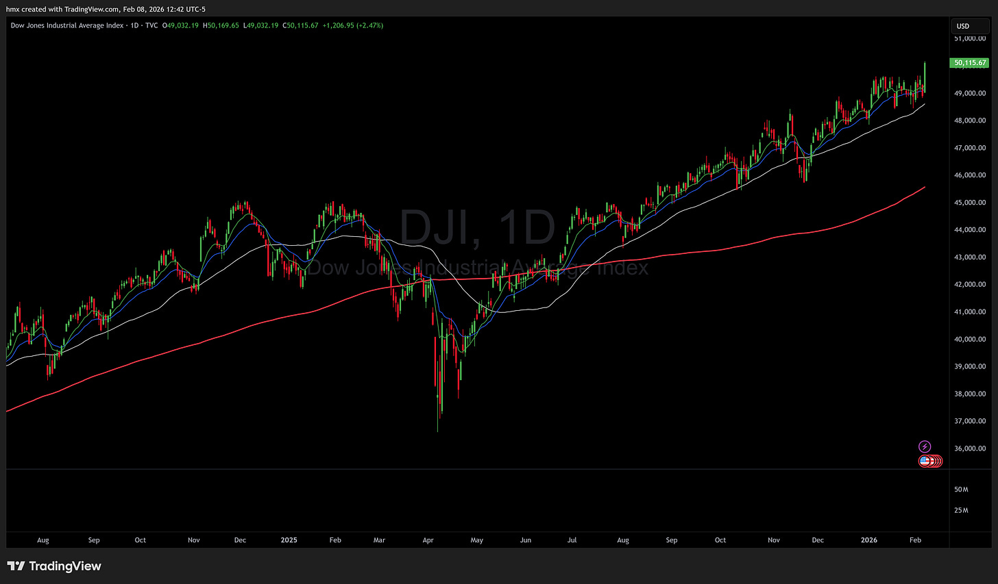 Happy Super Bowl Sunday! Last week the SPY 0.00%β narrowly finished down roughly -0.1%, the QQQ 0.00%β lagged with about a -1.8% drop, while the IWM 0.00%β outperformed with a +2.2% gain and the DOW 0.00%β climbed roughly +2.5% hitting all time highs, led by major cyclical names.