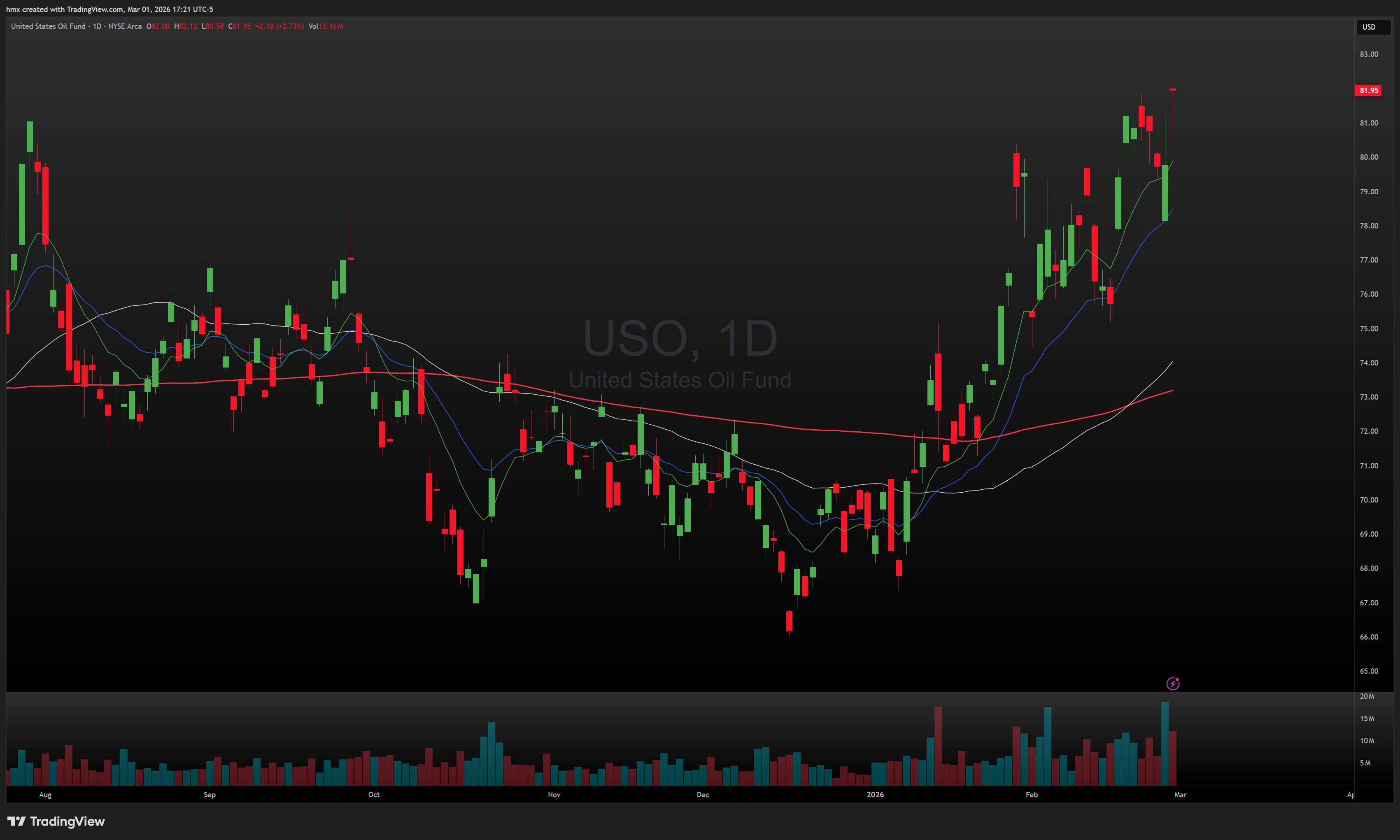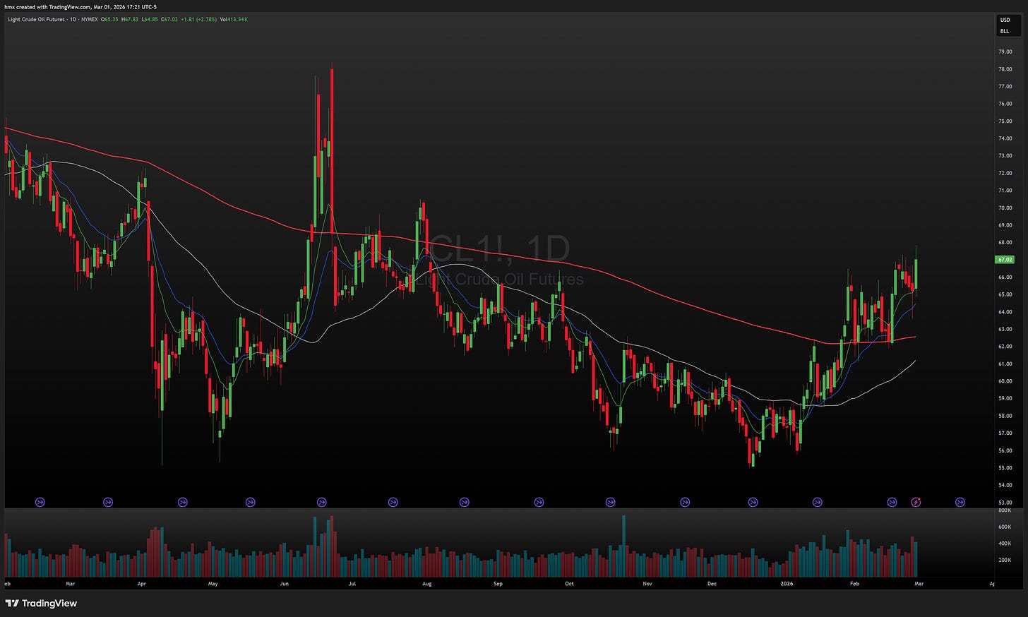 The story heading into Monday is the U.S. and Israeli strikes on Iran. With Iran a top OPEC producer and the Strait of Hormuz in play, the immediate focus is oil and anything tied to energy security. Analysts are estimating oil could open +11% when futures resume tonight based on perpetual swap pricing on Hyperliquid. Traders will also be watching for what that means for names like XOM and CVX. Defense stocks such as LMT and RTX are also squarely in focus given the escalation.