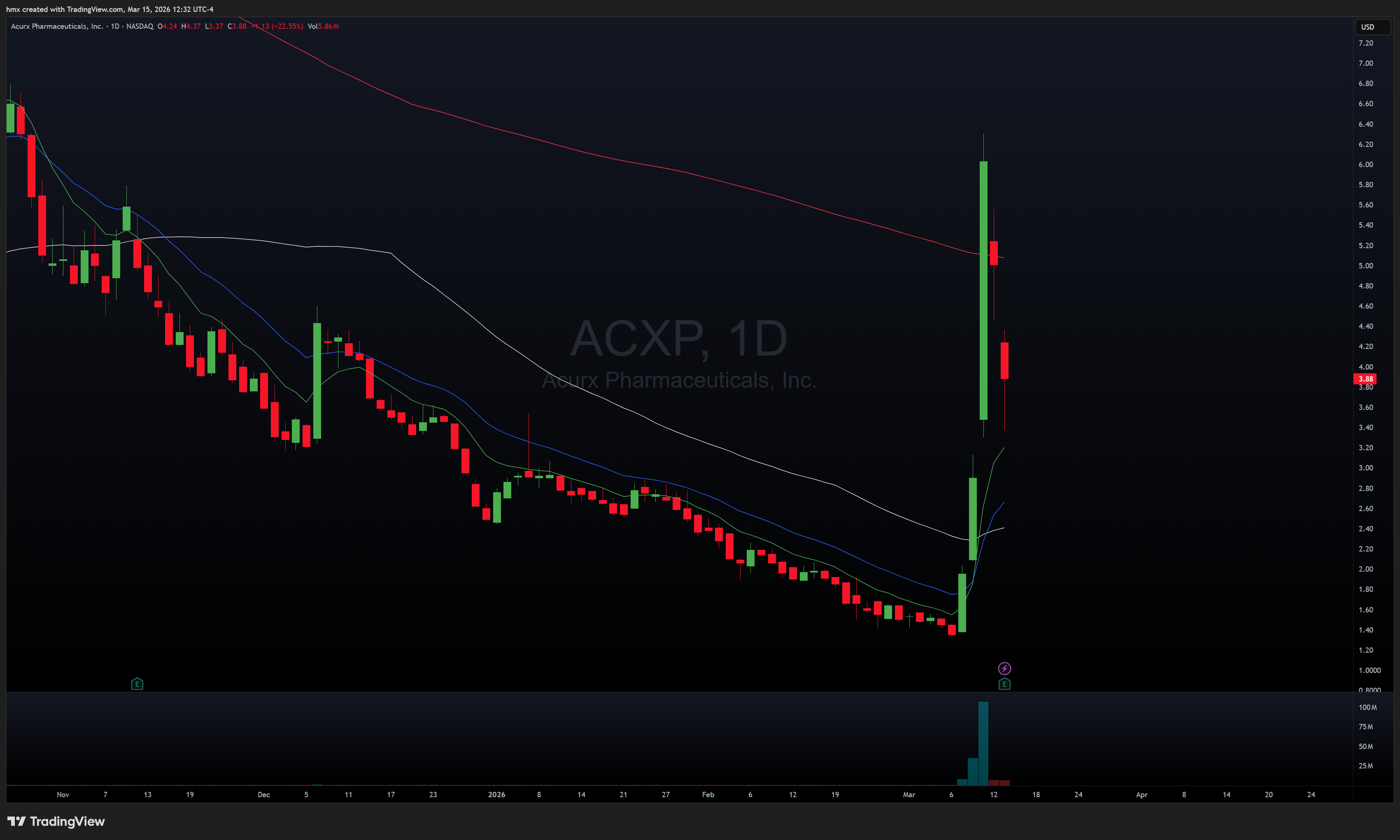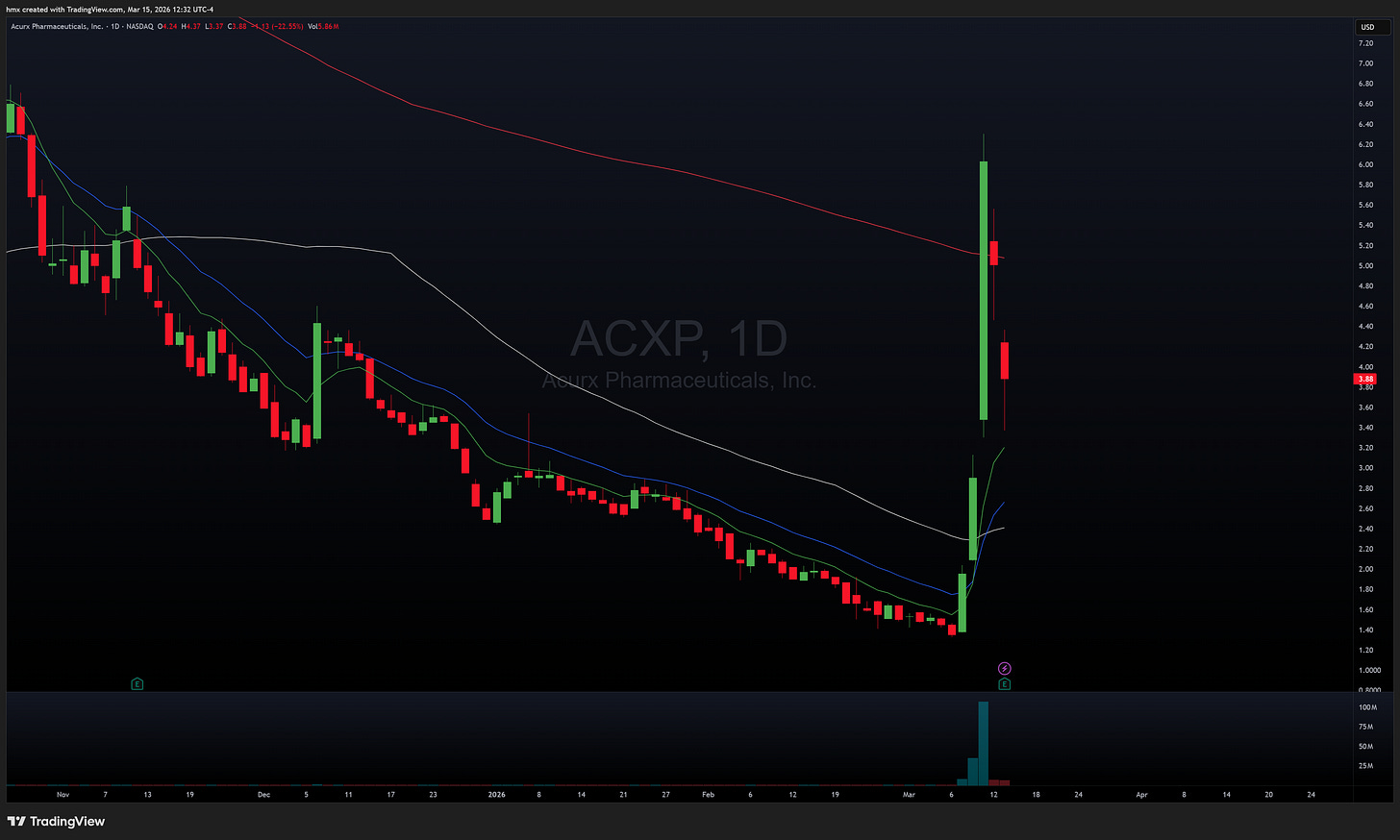 $ACXP led the week, ripping ~180% on a 2M float with 161M shares traded, running from $1.38 to $6.30 before fading to $3.88. $ATPC showed a similar move on an even tighter 400K float, doubling from $2.13 to $6.30 and closing at $4.44. $BIAF gained ~110% on 261M volume but held up better than most on the backside, while $ROMA spiked from $3 to $8.57 before settling near $5.40.