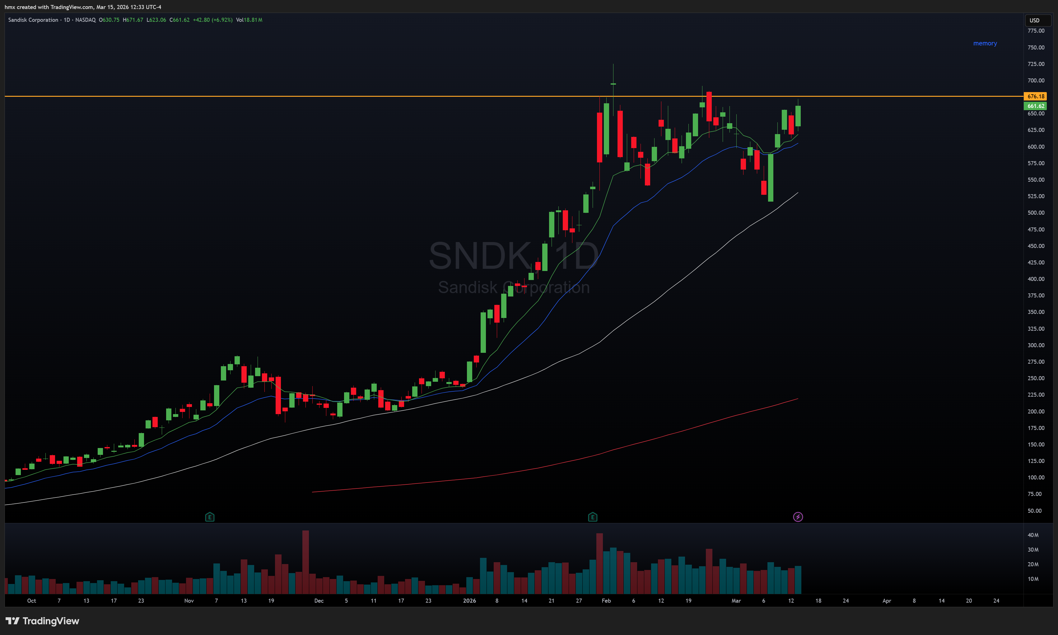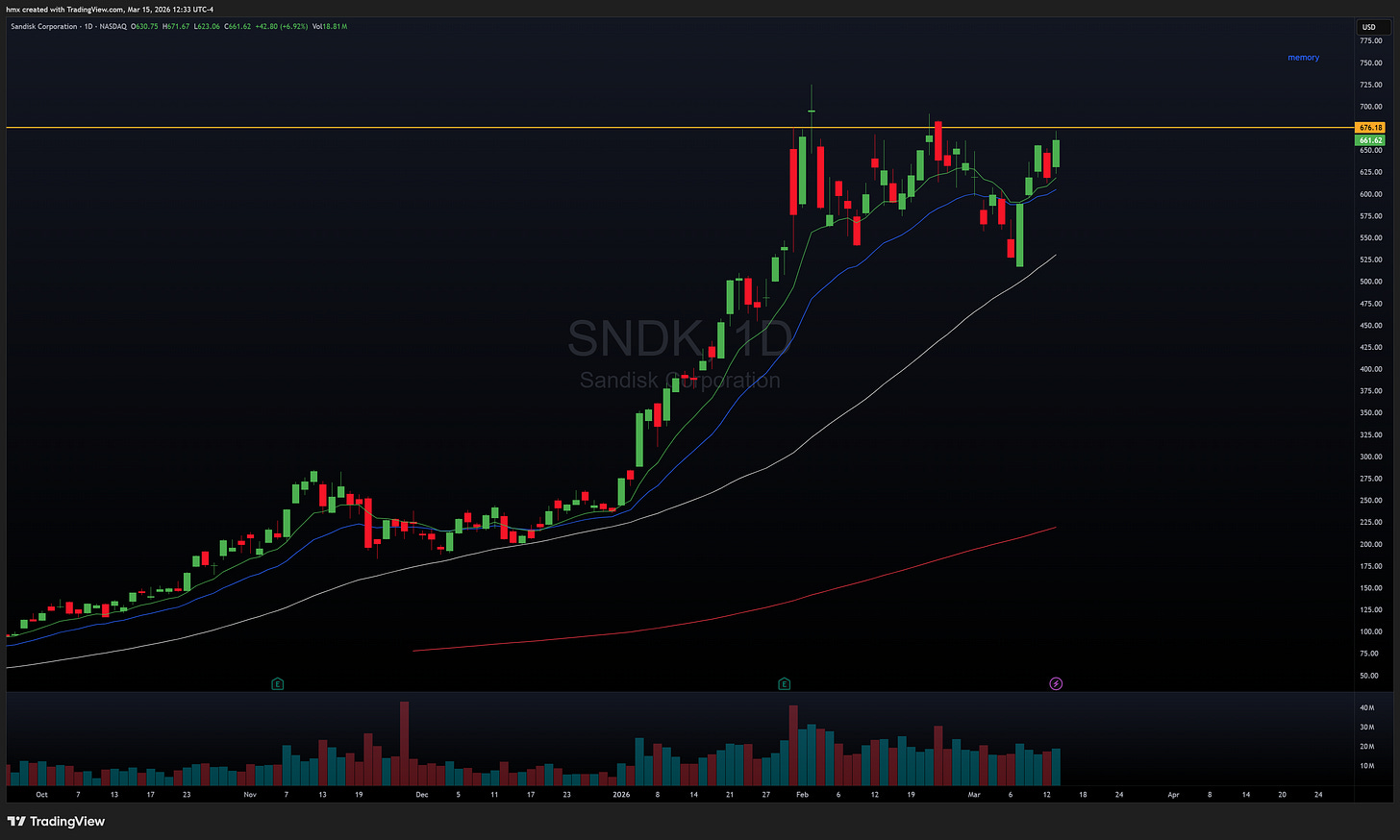 SNDK: creeping toward highs and a few days of tightening would be ideal here, but this one doesn’t feel like it wants to wait around.