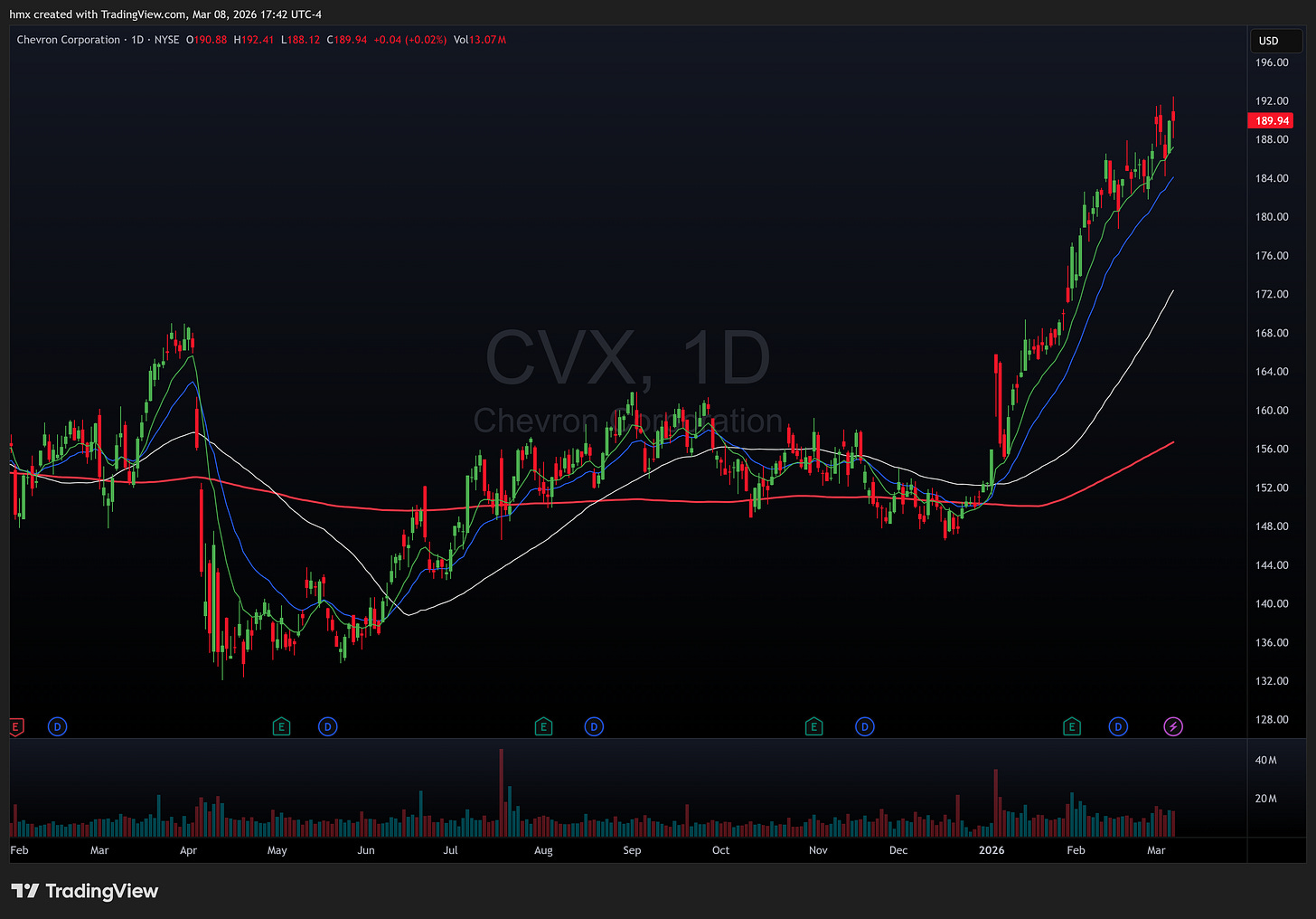 Citigroup estimated 7 to 11 million barrels per day temporarily removed from global supply. That’s not just a headline, that’s a regime change for energy markets. XOM 0.00%↑ and CVX 0.00%↑ were obvious beneficiaries, with CVX showing relative strength on Friday while nearly everything else bled.