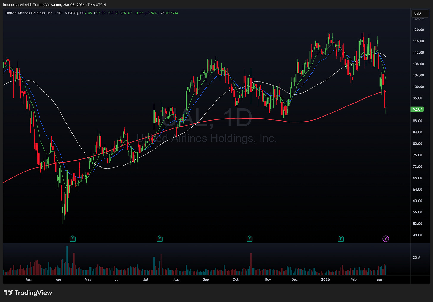 Tanker names like FRO 0.00%↑ and oil services like SLB 0.00%↑ pulled back all week. On the other side of that trade, airlines got destroyed with UAL 0.00%↑ and ALK 0.00%↑ both down over 3% on Friday alone.