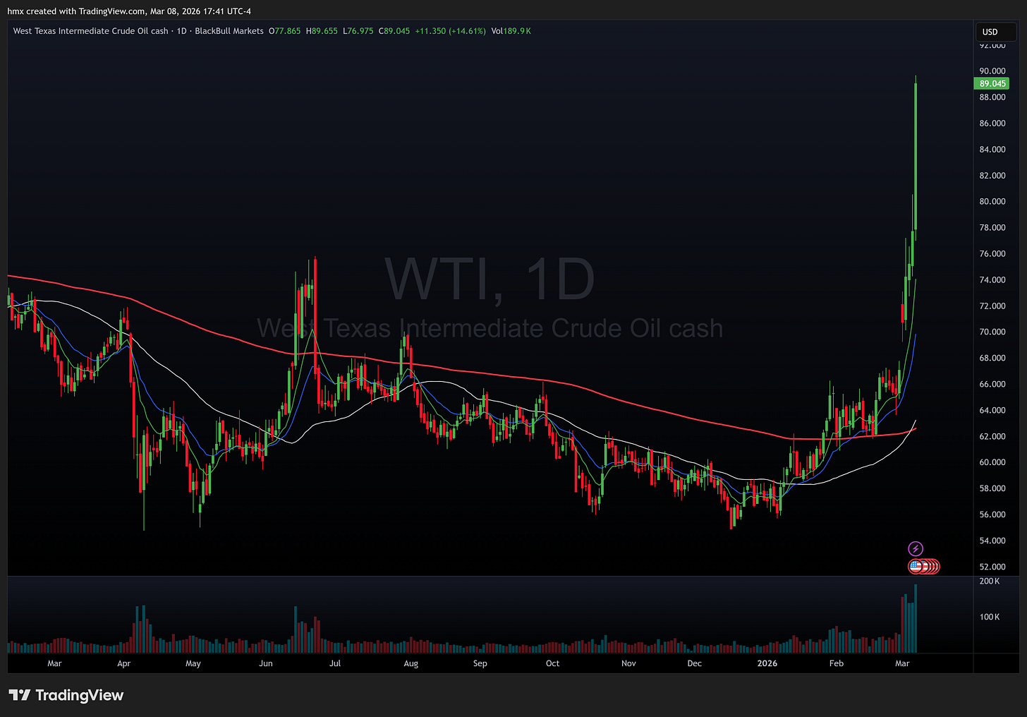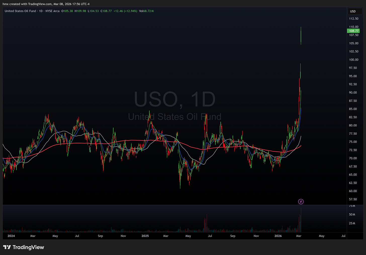 This was a war week, and everything else was background noise. US and Israel launched strikes on Iran starting last Saturday, Iran retaliated across the Gulf, and within days the Strait of Hormuz went from the world’s most important oil chokepoint to a no-go zone. Zero crude or LNG transits on Sunday and Monday. Fifty-five fully loaded supertankers sat stranded in the Gulf by midweek. Kuwait declared force majeure. Saudi Arabia’s Ras Tanura refinery got hit by drones and went offline. Qatar shut down LNG production. WTI 0.00%↑ ripped past $90 on Thursday for the first time since October 2023, up roughly 25% in four sessions, on track for the largest weekly percentage gain in at least two decades.
