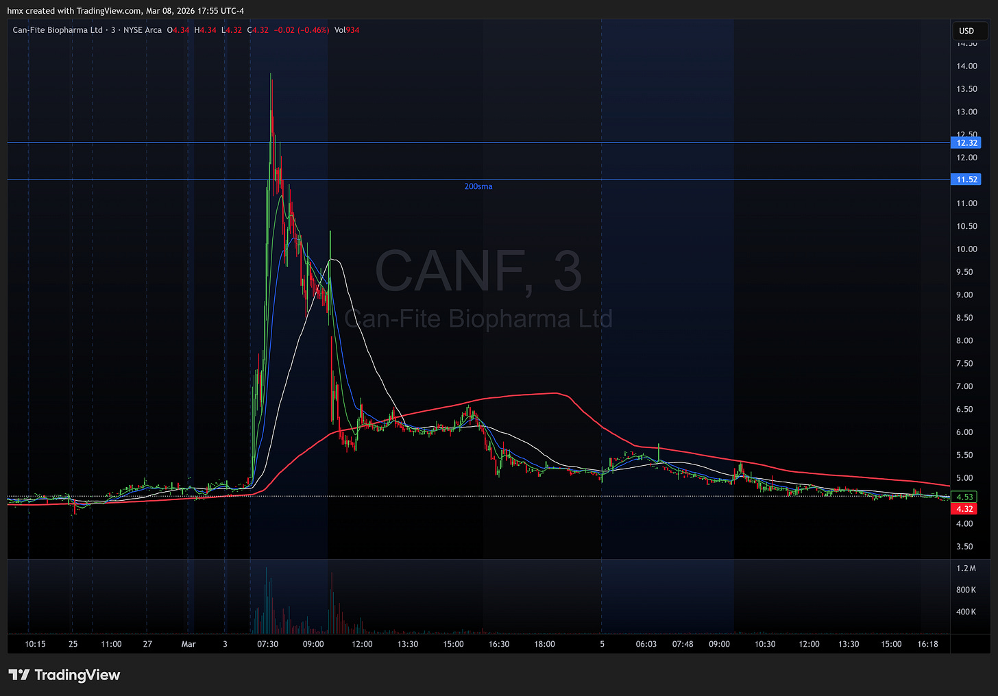 On the other side, several names this week were textbook supply plays. CANF 0.00%↑ is the poster child, ripping from $4.51 all the way to $10.40 intraday before round-tripping the entire move and closing at $4.55, basically unchanged on the week. TMDE 0.00%↑ ran a similar script, pushing to $4.77 before fading back to $2.92. GXAI 0.00%↑ gained 52% on the week but gave back significantly from its $2.43 high. INDO 0.00%↑ and HYMC 0.00%↑ were the clean backside fades, dropping 33% and 22% respectively as prior momentum unwound.